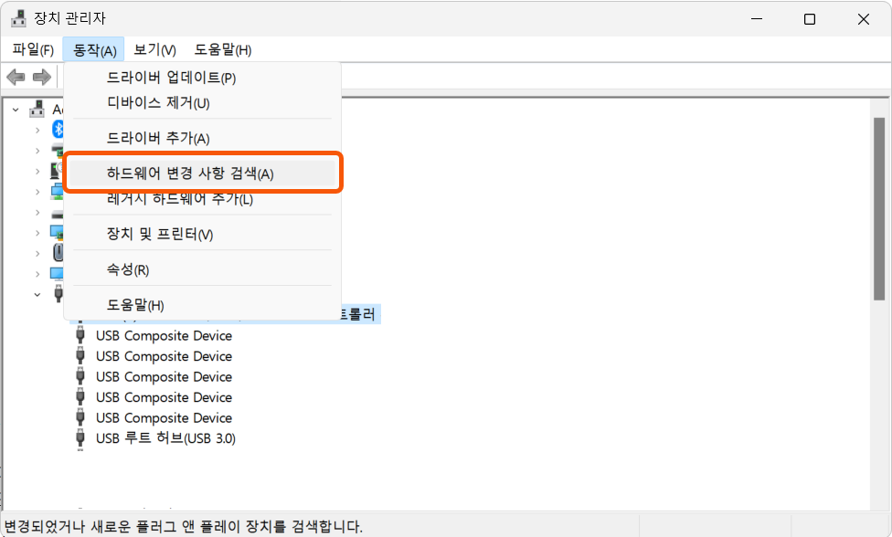 2. 컴퓨터를 재 부팅한 후, 다시 장치 관리자 앱으로 돌아와 상단 동작 메뉴의 하드웨어 변경 사항 검색을 클릭해 줍니다. 위 옵션을 클릭하면 자동으로 필요한 드라이버를 검색하여 설치를 진행합니다.